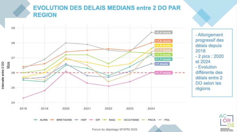 Ainsi, en 2024, le délai médian entre 2 mammographies de dépistage organisé est de 26 mois dans notre région.
