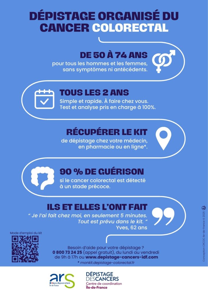 Si vous avez des questions concernant votre suivi, vous pouvez contacter l’équipe de suivi du Dépistage Organisé du Cancer Colorectal (DOCCR) du CRCDC Ile-de-France au 01 48 42 77 03 ou par mail à cellule-doccr@depistage-cancers-idf.fr. Merci de préciser vos nom, prénom, date de naissance ainsi que votre identifiant (indiqué dans le courrier du CRCDC).